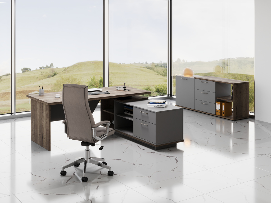 Мебель для кабинета руководителя в современном стиле. Основные акценты сделаны на высокое качество материалов и внимание к деталям. Продуманная конструкция обеспечивает максимальное удобство и подчеркивает статус владельца. Эта серия мебели станет прекрасным выбором для тех, кто ценит качество, инновационный дизайн и максимальный комфорт в своем офисе.